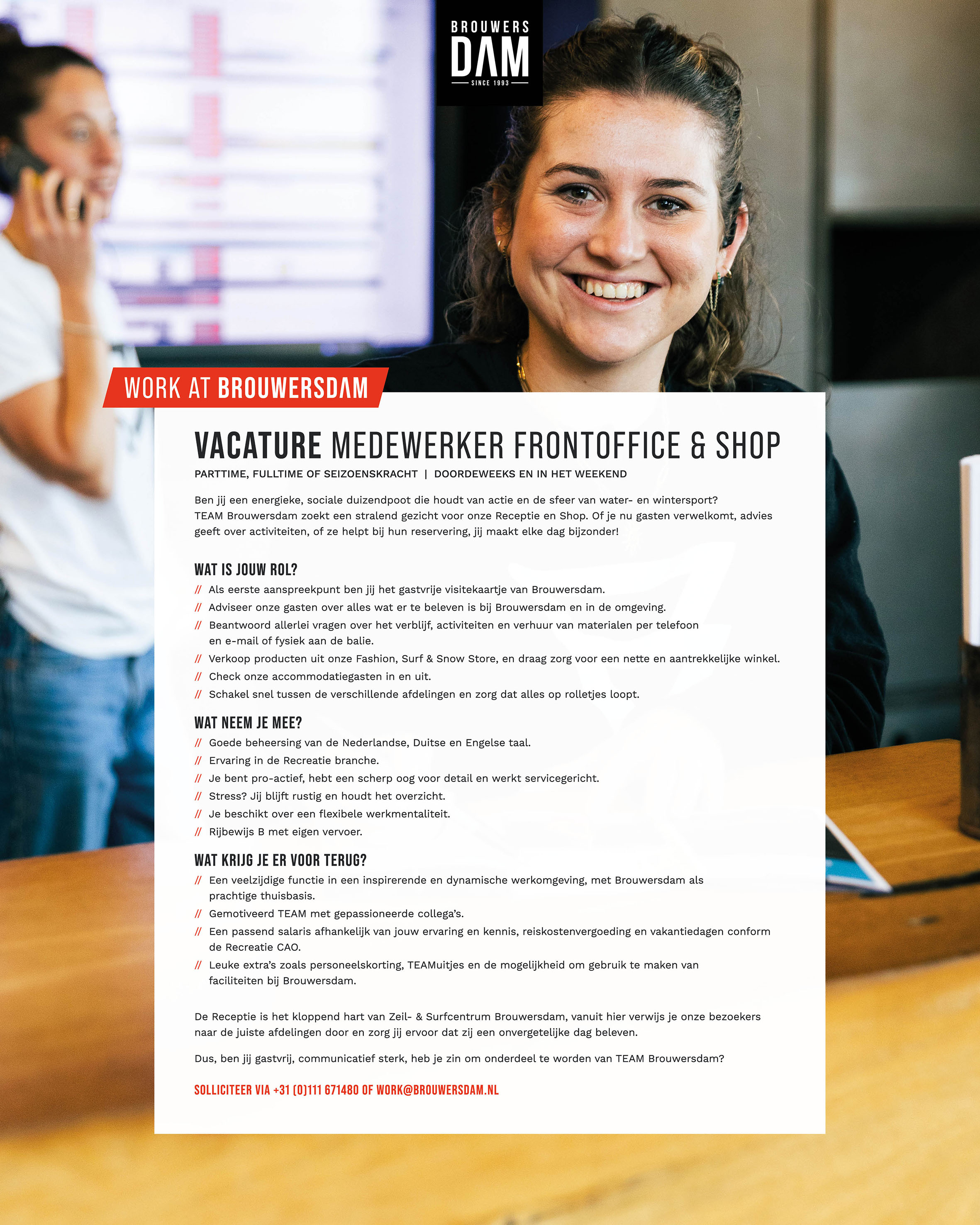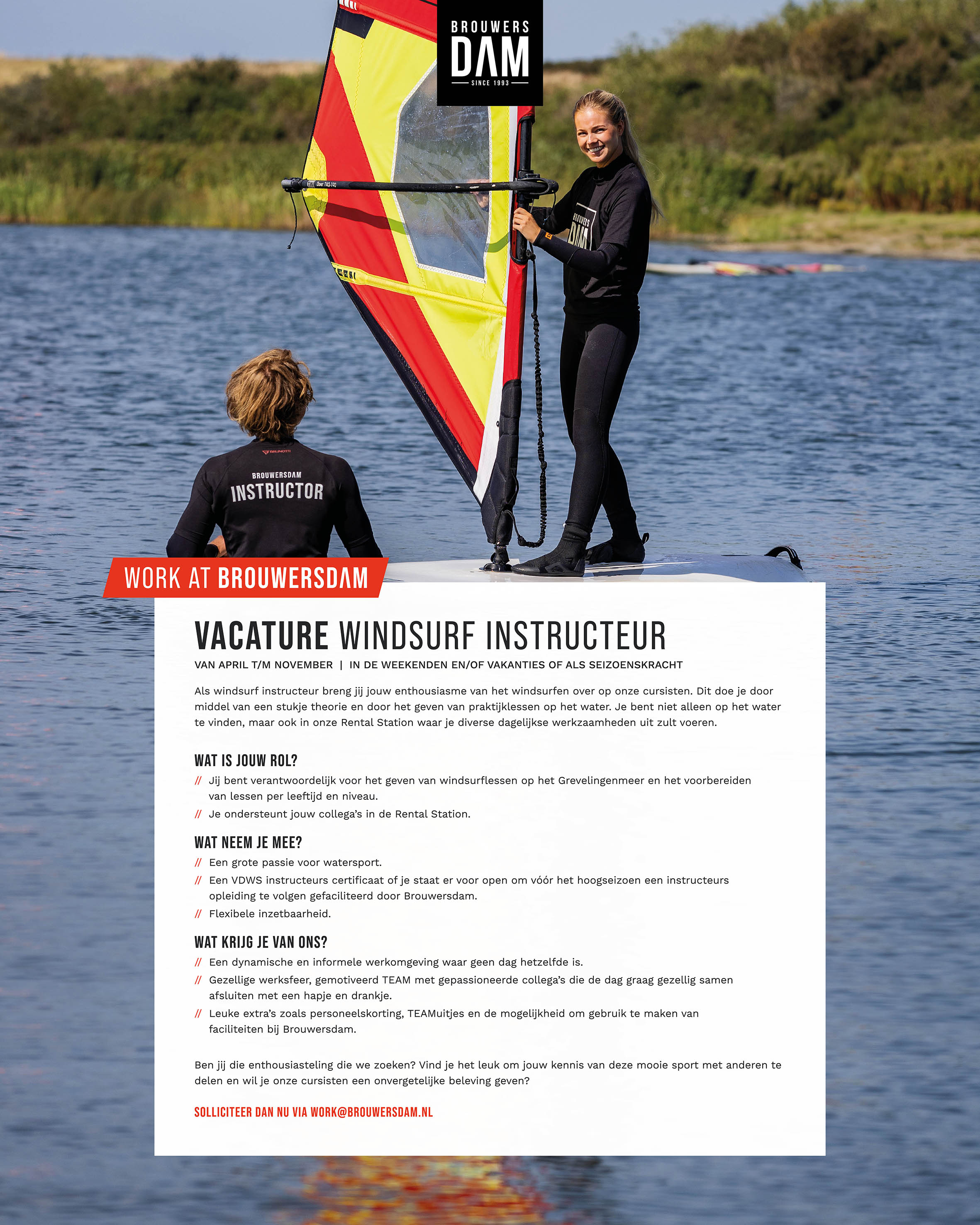 Voor diverse afdelingen binnen Zeil- & Surfcentrum Brouwersdam zijn wij op zoek naar nieuwe collega’s. Check onze vacatures of kom eens langs voor een gesprek!
